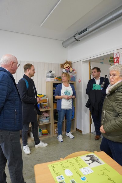 „Aktuell sind wir in der Notbetreuung“, erklärte Mark den Besucher*innen: Viele Erzieherinnen seien krank, die Betreuung daher nur eingeschränkt möglich und nicht alle Räume nutzbar, da immer zwei Fachkräfte pro Raum anwesend sein müssten. Trotzdem gebe das ganze Team das Beste, um den mehr als 100 Kindern gerecht zu werden und möglichst alle Betreuungswünsche und –nöte der Eltern zu berücksichtigen. Mehr als 50 Kinder sind für die verlängerte Öffnungszeit oder den Ganztag angemeldet, sie essen also auch im Kinderhaus zu Mittag. Eine logistische Herausforderung, denn Kinder und Essen müssen auf unterschiedliche Räume auf verschiedenen Stockwerken verteilt werden – und danach werden die Kinder „in Schichten“ zum Händewaschen und Zähneputzen geschickt, wie Mark schilderte. Neben den beengten Verhältnissen im Kinderhaus waren Mark insbesondere die Themen Sprachförderung und Integration im Austausch mit dem Abgeordneten wichtig: Im Kinderhaus Schillerstraße hätten 70 Prozent der Kinder einen Migrationshintergrund, rund ein Zehntel sind Inklusionskinder, die mehr Betreuung brauchen. „Das ist gelebte Integration“, sagte Mark und schilderte, dass das rund 25 Personen starke Team viele Sprachen abdecken und übersetzen könne. Allerdings sei es wichtig, dass die Kinder schnell selbst Deutsch lernen, damit die Zeit für die Übersetzung nicht für die Arbeit „am Kind“ fehle. Aktuell gebe es jedoch keinen eigenen Raum für die Sprachförderung, sie und ihre Kolleginnen nutzten daher oft andere Räume, die beispielsweise für Kreativangebote gedacht seien. Kein tragbarer Zustand, fand die stellvertretende Leiterin: „Wir sind eine Bildungseinrichtung.“ Ihr Anliegen an Bürgermeister Thomas Schelkle und die Vertreter*innen aus dem Gemeinderat war daher mindestens ein weiterer Gruppenraum außerhalb des beengten Hauses. An den Bundestagsabgeordneten richtete sie den Wunsch nach weniger Bürokratie und einer gleichwürdigen und respektvollen Honorierung der Arbeit von Erzieherinnen und Kinderpflegerinnen. „Ich habe höchsten Respekt von Ihrer Arbeit“, sagte Marcel Emmerich, als Kristin Mark sich verabschiedete, um wieder ihren Dienst in der Gruppe aufzunehmen. „Kindertagesstätten sind wichtige Säule unseres Bildungssystems und sollten so aufgestellt sein, dass die Kinder die beste Chancen haben, ihre eigene Persönlichkeit zu entwickeln und auszuleben. Wie systemrelevant die Arbeit der Mitarbeiterinnen ist, dürfte spätestens in der Pandemie allen klar geworden sein. Deshalb ist es wichtig, dass die Politik ihre Arbeit bestmöglich unterstützt. Aus meinem Besuch in Munderkingen nehme ich viel für meine Arbeit im Wahlkreis und in Berlin mit.“