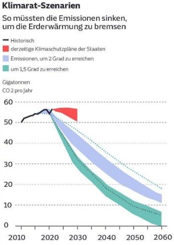 - Klimaberatungen in Dubai, die Reduktion der Emissionen ist viel zu langsam (s. Grafik oben).